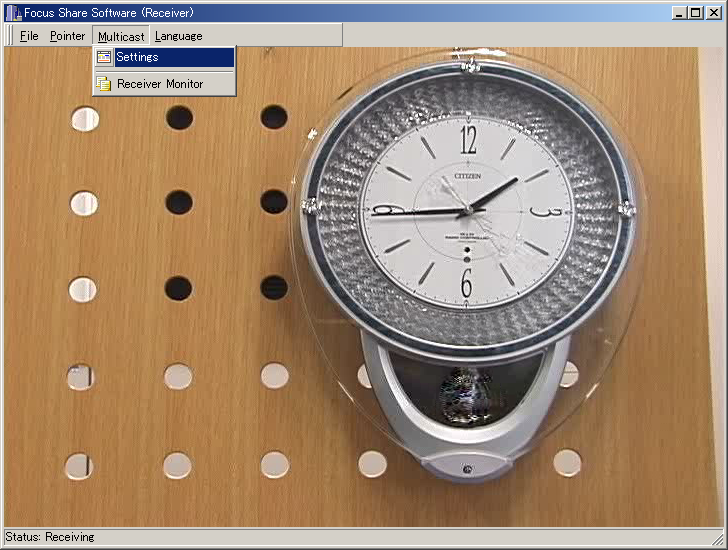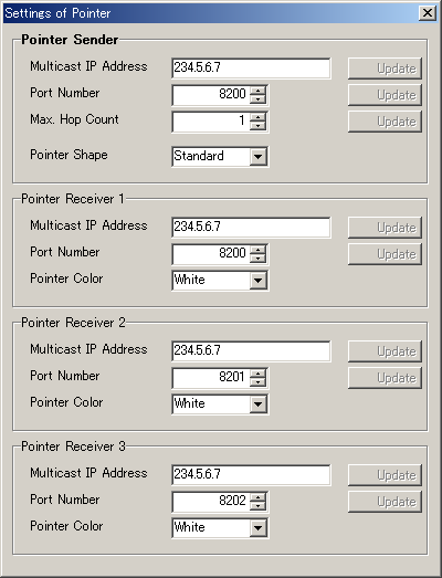 | Pointer-sharing If you want to run multiple receiving applications and to share multiple pointers among them, select "Poitner" from main menu, then "Settings" To avoid address conflict, please make sure that a pair of "Multicast IP Address" and "Port Number" in "Pointer Sender" is different from the "Pointer Sender" settings of other receiving applications. Even if you use the same "Multicast IP Address" and "Port Number" as other receiving applications, no errors are detected, however, behaviors of pointers will be strange. When pointer information is received, pointer position is updated. Thus a pointer may blink if the same settings of "Pointer Sender" are used in more than one receiving applications. Moreover, to receive pointer information properly, settings in "Pointer Receiver 1", "Pointer Receiver 2" or "Pointer Receiver 3" have to match the settings in "Pointer Sender" . Please note that an receiving application does not show its own pointer unless its pointer information is received through multicasting. |
